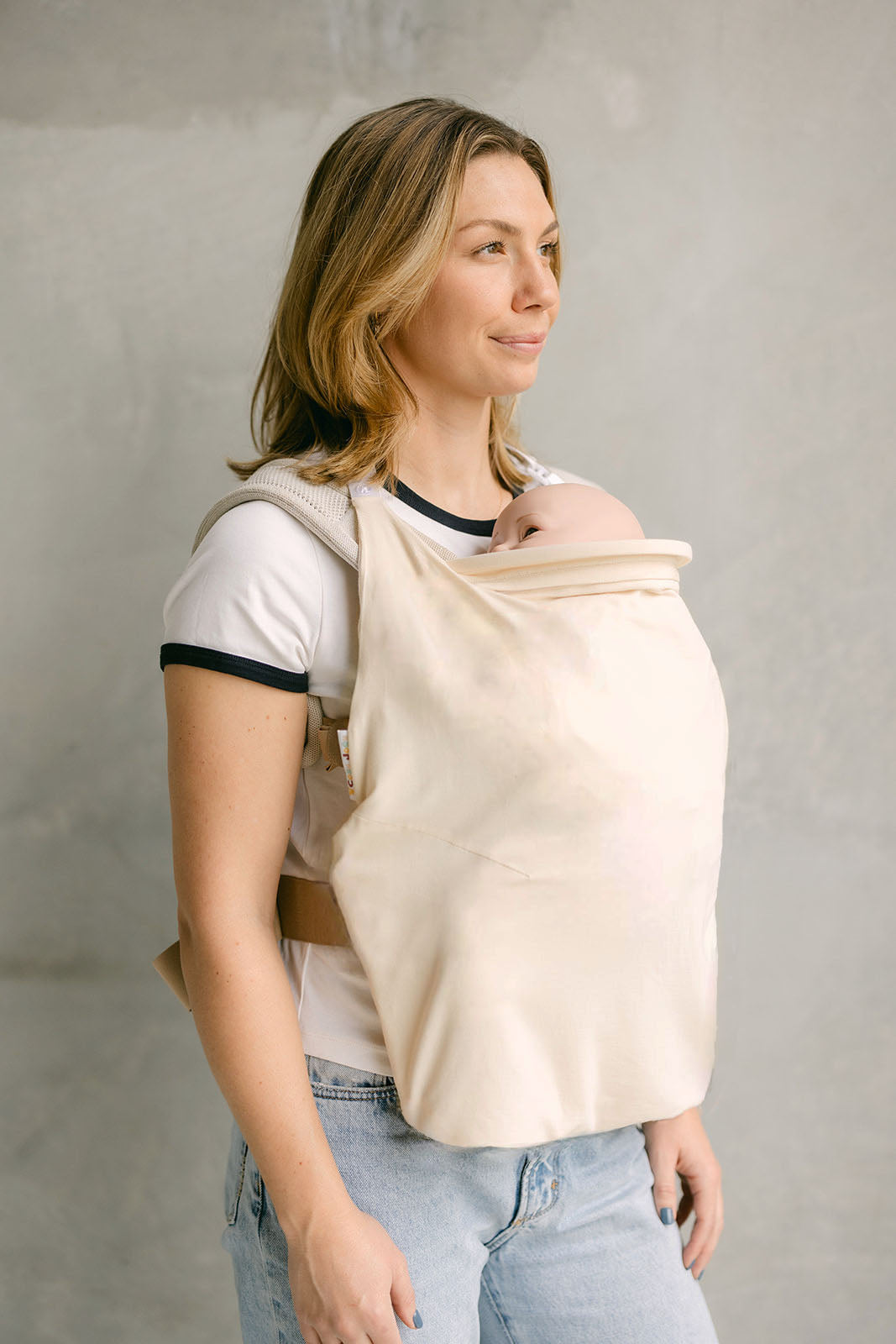 • Structured neckline → keeps airflow moving and your baby in view. It doubles as a mini sun shield so you can protect baby’s head if you forget a hat, or baby won’t wear one (IYKYK).